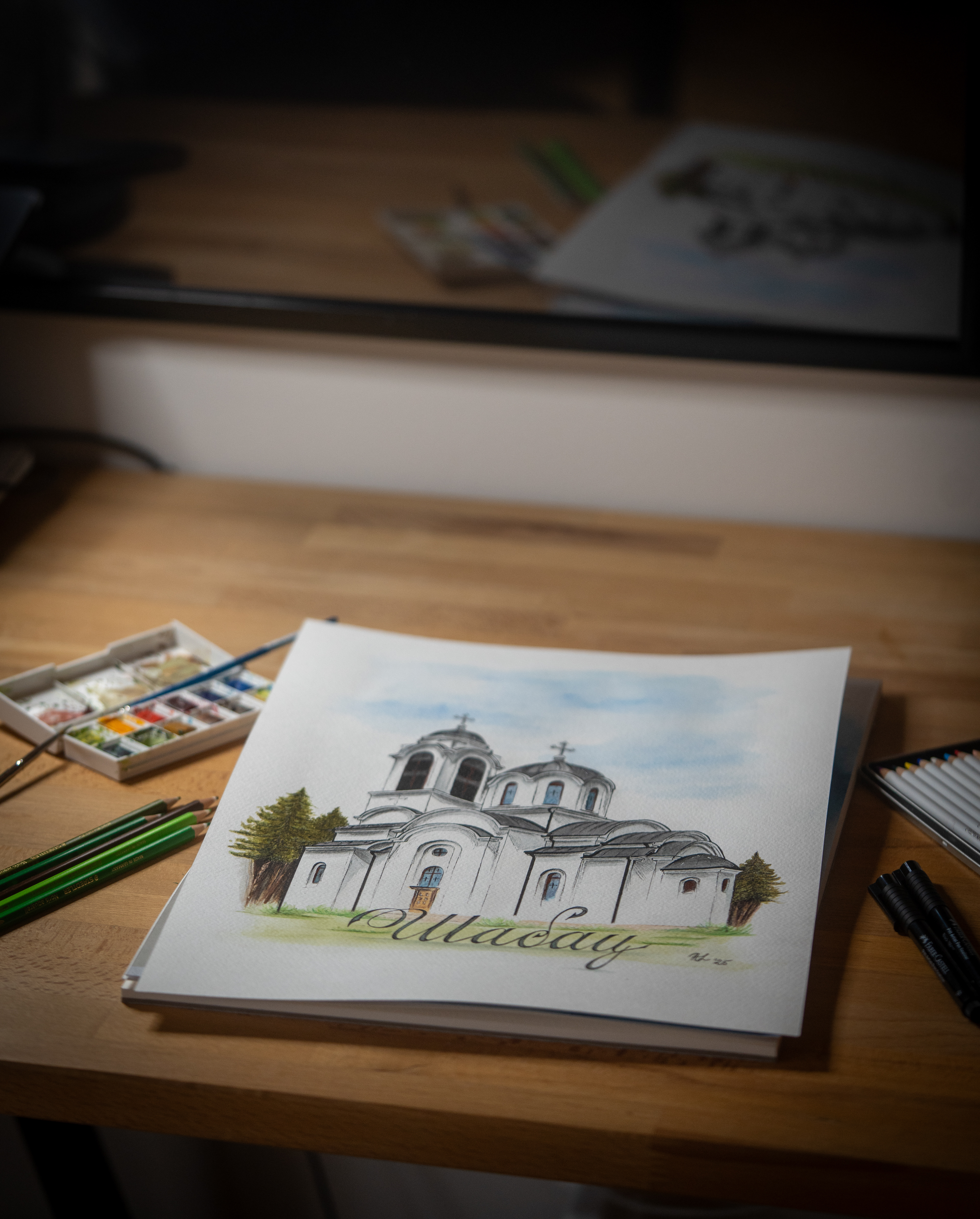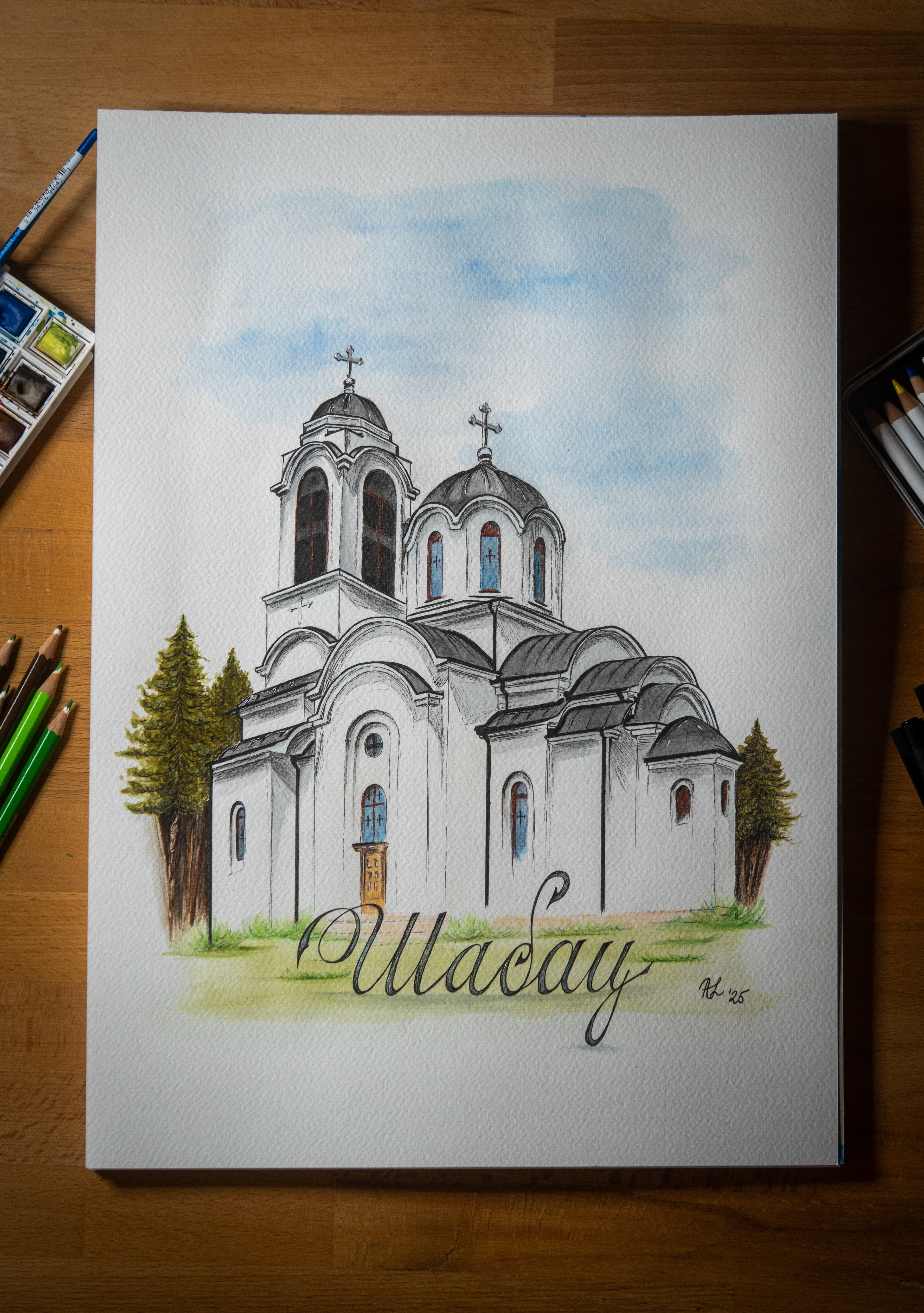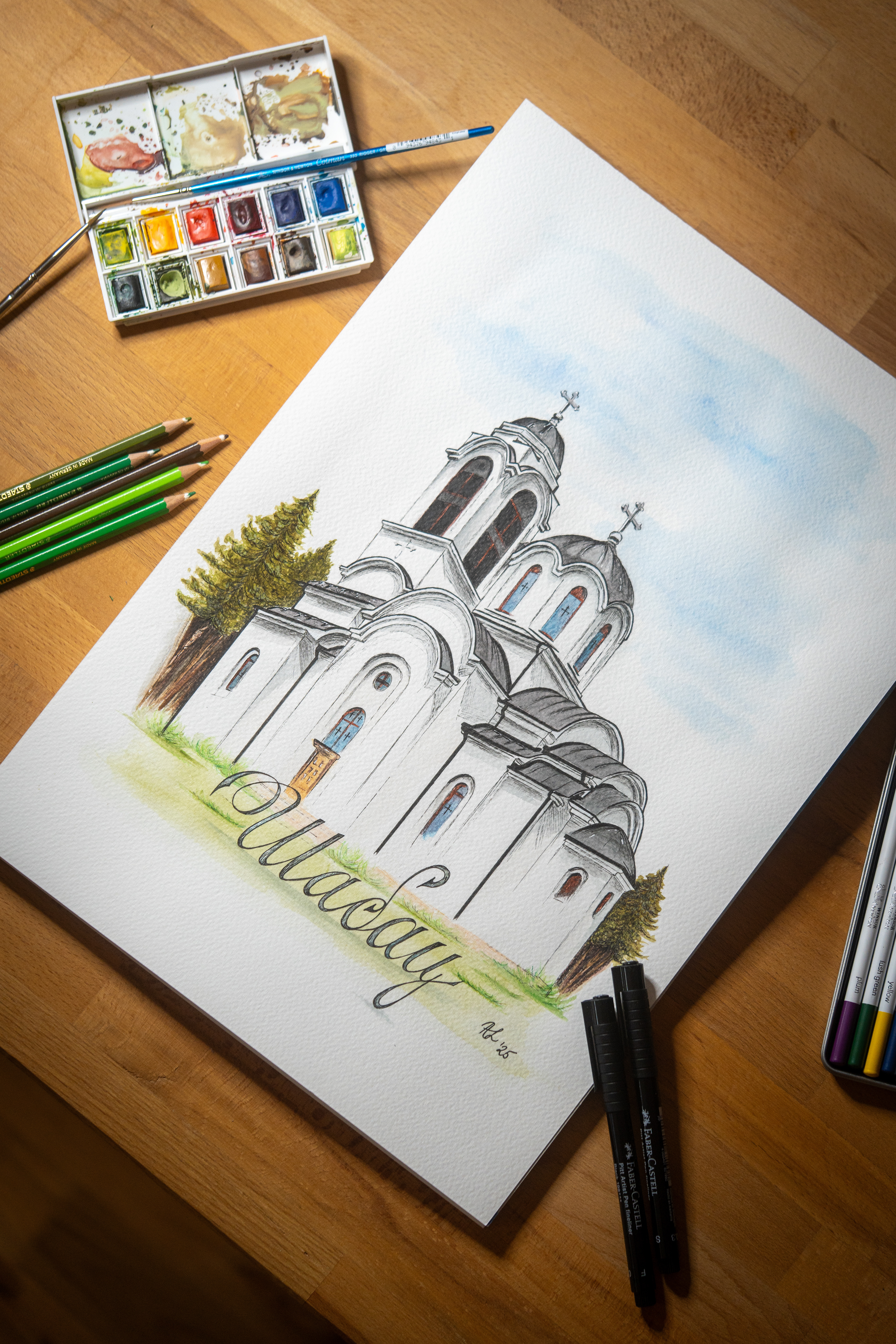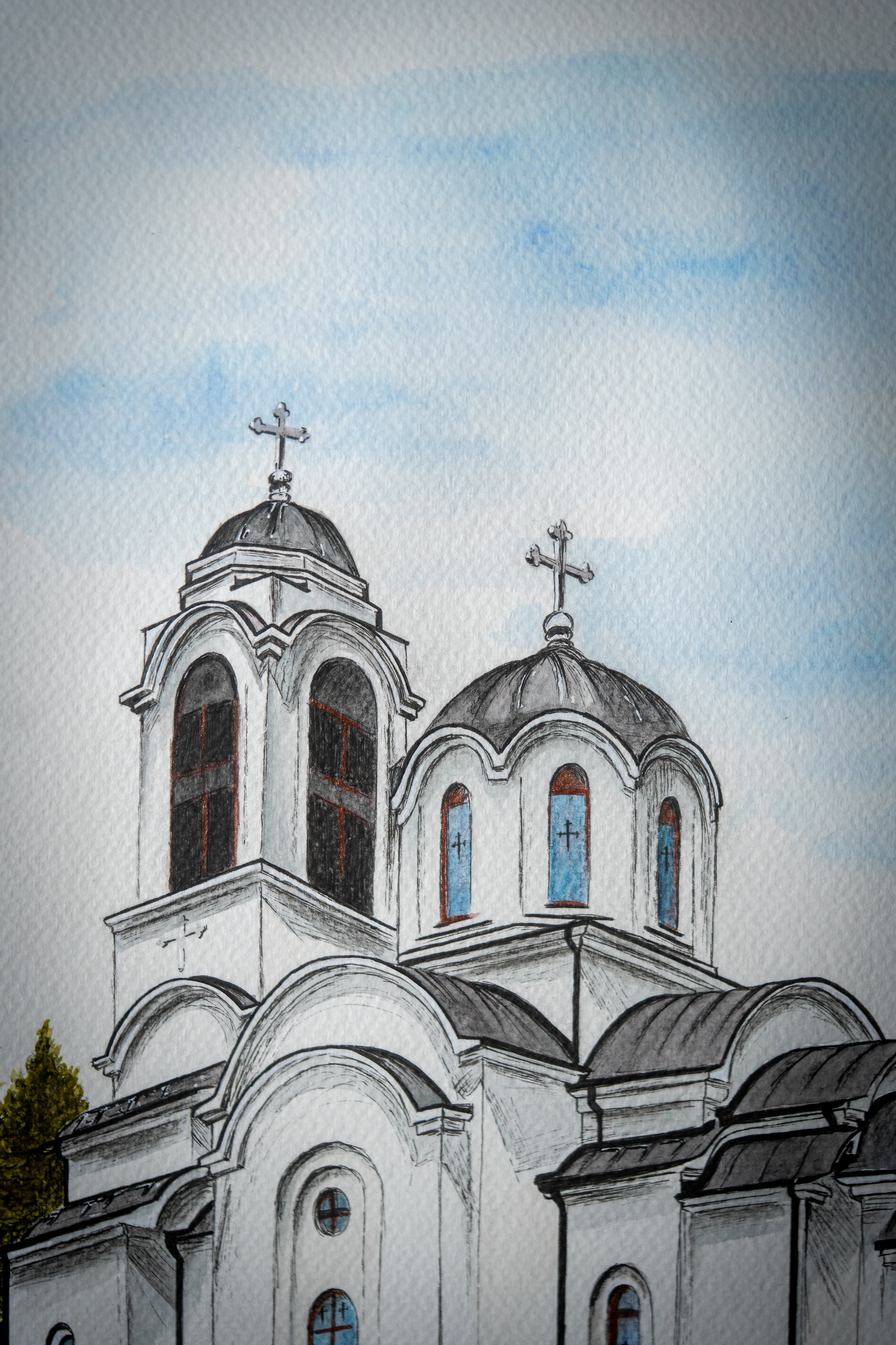A soft painting of the Church of the Holy Trinity in Sabac - Serbia, surrounded by the fresh colours of spring. The church stands peacefully amidst blooming trees and gentle green fields, capturing the calm of the season. SOLD